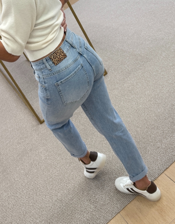 Išskirtinumo suteikia subtili leopardinė nugaros juosmens detalė – mažas, bet charakteringas akcentas, paverčiantis klasikinius džinsus išskirtiniais.