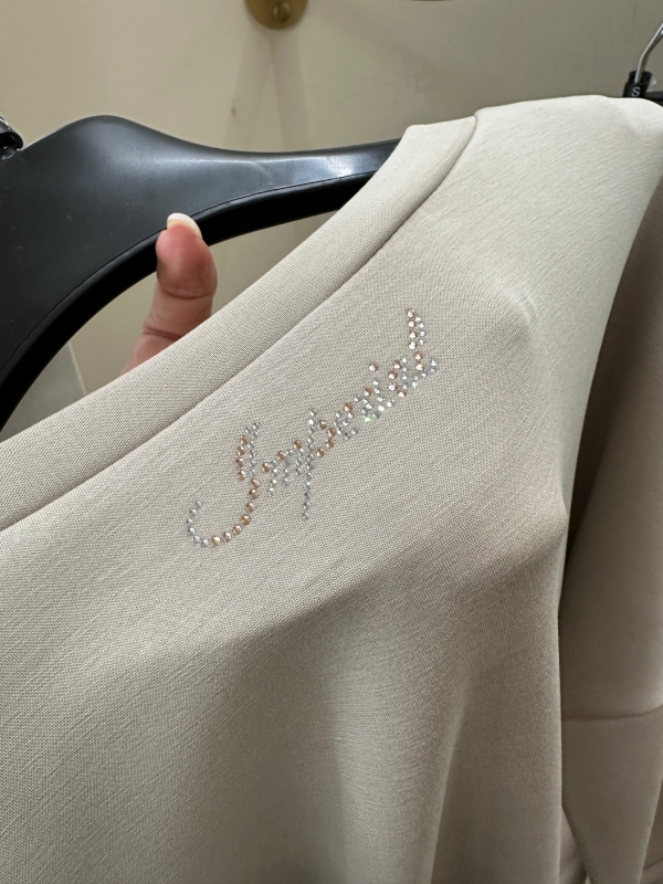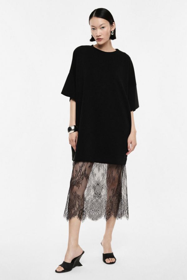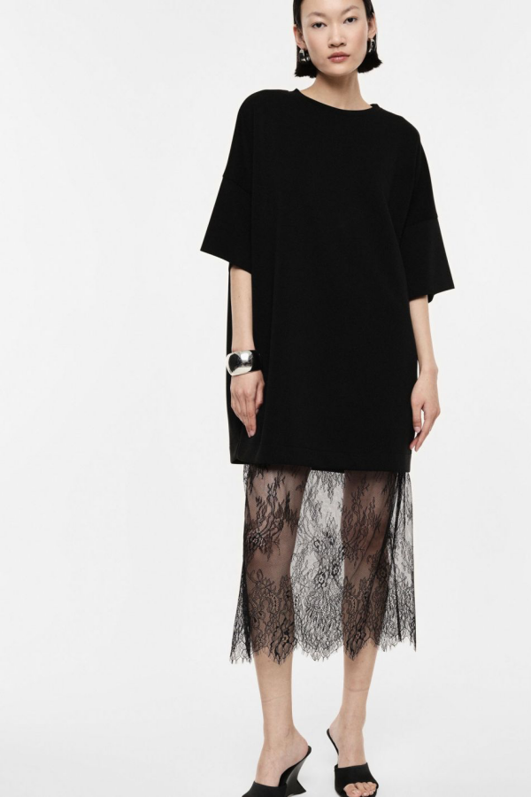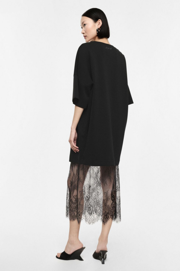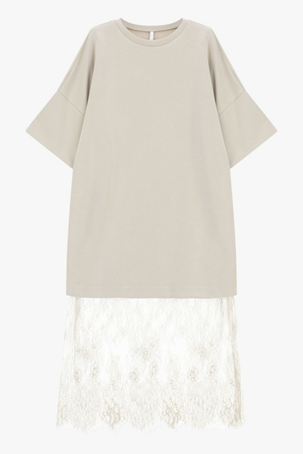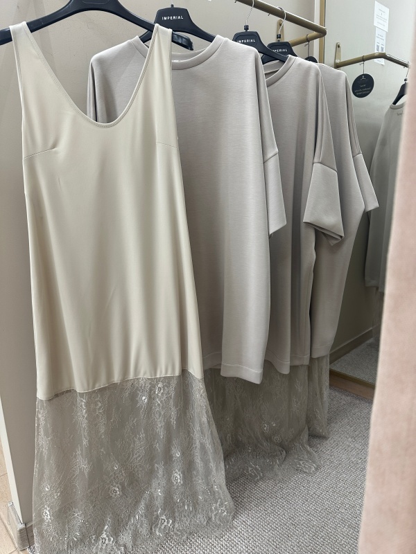 Viršutinė tunika pasižymi moderniu laisvu kirpimu, plačiomis rankovėmis ir minimalistine estetika, o priekyje subtiliai spindi dekoratyvus IMPERIAL logotipas su kristalais. Apatinė suknelė suteikia lengvumo ir moteriškumo – jos apačią puošia prabangus gipiūras, elegantiškai matomas iš po tunikos krašto.